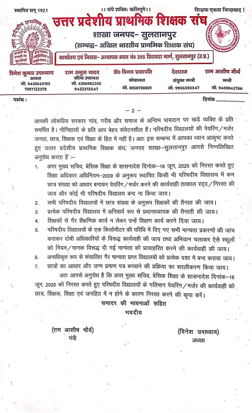 वहीं आज दिनांक 13 जुलाई 2025 को सदर विधायक माननीय राज बाबू उपाध्याय को जनपद एवं ब्लॉक के पदाधिकारियों व शिक्षकों के साथ मिलकर ज्ञापन सौंपा गया। ज्ञापन प्राप्त करते हुए विधायक राज बाबू उपाध्याय ने कहा कि विद्यालयों का मर्जर/पेयरिंग ग्रामीण शिक्षा व्यवस्था को प्रभावित करेगा और इससे बच्चों की शिक्षा बाधित होगी। उन्होंने शिक्षकों और बच्चों की भावनाओं को देखते हुए ज्ञापन को मुख्यमंत्री तक पहुंचाने का आश्वासन दिया।