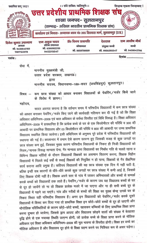 प्रांतीय संगठन के आह्वान पर विद्यालय मर्जर/पेयरिंग के विरोध में उत्तर प्रदेशीय प्राथमिक शिक्षक संघ जनपद सुलतानपुर ने शिक्षकों के साथ मिलकर,जनप्रतिनिधियों के माध्यम से माननीय मुख्यमंत्री को संबोधित ज्ञापन सौंपा। इस क्रम में कल लम्भुआ विधायक माननीय सीताराम वर्मा को जिला अध्यक्ष के नेतृत्व में ज्ञापन दिया गया था।