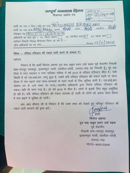 सम्पूर्ण समाधान दिवस में सोमवार को फिरोज़ अहमद पुत्र स्वर्गीय अब्दुल हसन, निवासी ग्राम–मदापुर समसपुर इस्लामपुर परती तहसील घोसी ने अधिकारियों के समक्ष एक महत्वपूर्ण शिकायत पत्र प्रस्तुत किया। शिकायत में उन्होंने बताया कि उनका परिवार रजिस्टर वर्ष 2018 से सील होने के कारण लोगों को अत्यधिक परेशानी का सामना करना पड़ रहा है।