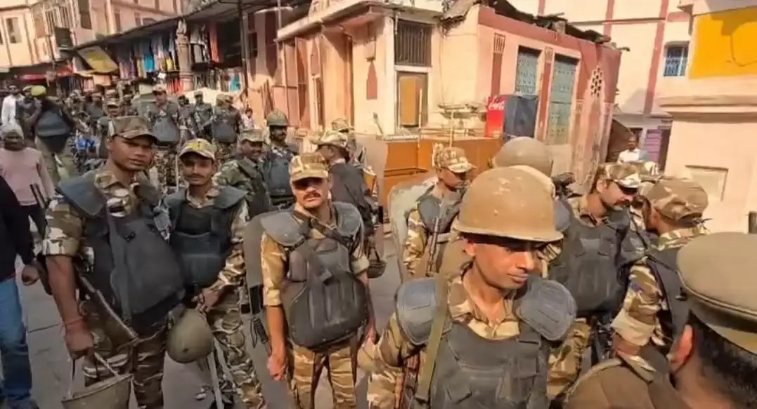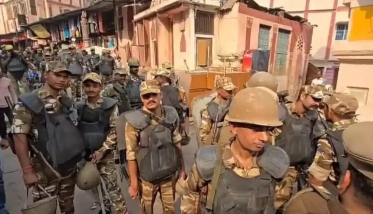 दशाश्वमेध क्षेत्र के मदनपुरा नई सड़क दालमंडी तक के इलाके में पुलिस और पैरामिलिट्री के जवानों ने भ्रमण कर सुरक्षा व्यवस्था परखी।